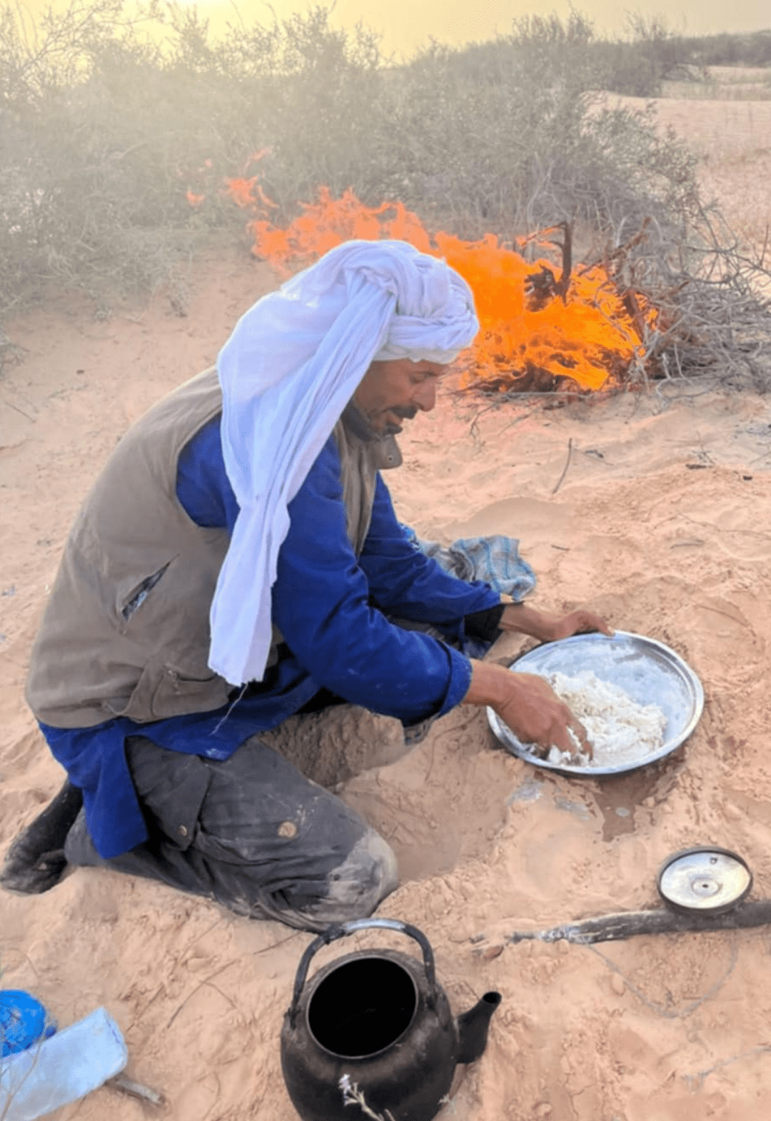 Nos savoir-faire transmis : tout ce que je sais, je l’ai appris de ma famille, et je le transmets à mon tour. Nous savons chercher le bois, planter les tentes, préparer les galettes sur le sable chaud, trouver l’eau. Nous utilisons les plantes du désert pour soigner et pour cuisiner.