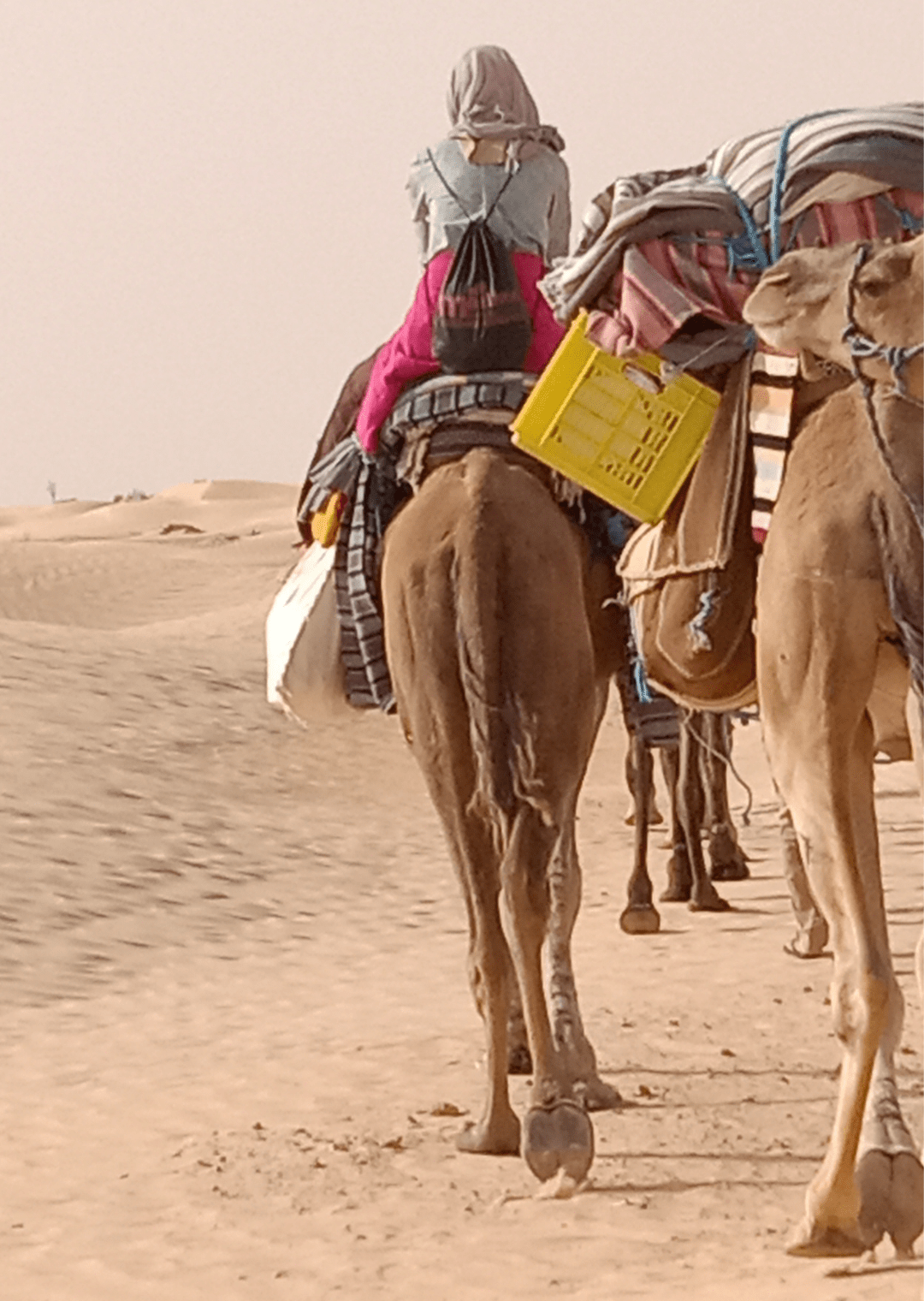 Et même si on croit parfois que c’est le néant, il y a toujours de la vie autour : d’autres familles, des voyageurs, la police, l’armée, les chameliers. Le désert veille sur nous autant qu’on veille sur lui.